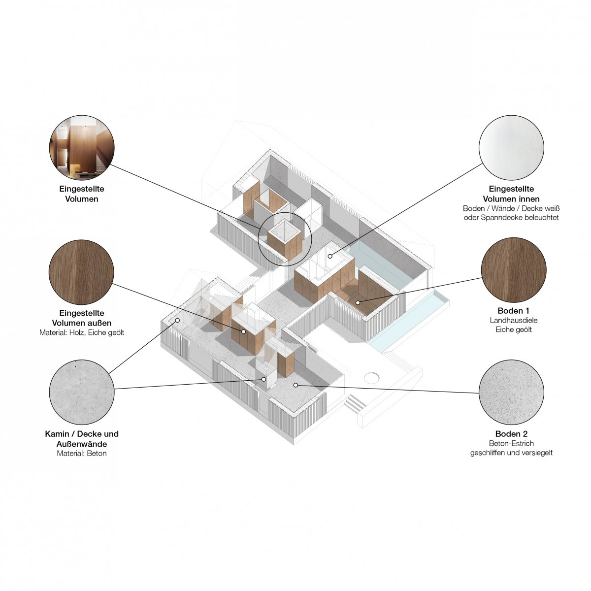 Der Entwurf zeichnet sich durch einen sehr klaren Entwurfsansatz mit einer offeneren Wohnstruktur im Erdgeschoß aus. Das Gebäudeensemble besteht aus einem zweigeschossigen und einem flachen Gebäude-teil, die in der Mitte durch einen untergeordneten Baukörper miteinander verbunden sind. Der eingeschossige Baukörper auf der Westseite beinhaltet dabei folgende Wohnbereiche: Küche, Esszimmer und Wohnzimmer. Im Hauptbaukörper befinden sich im Erdgeschoß der Wellnessbereich, sowie ein zweites Wohnzimmer. In den Obergeschoßen sind die Privaträu-me angeordnet. Der sog. Verbinder zwischen den beiden Hauptbaukörpern bildet im Erd-geschoß den Bereich des Ankommens und zugleich den repräsentativen Aufgang aus der Tiefgarage.